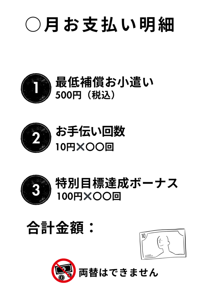 | お手伝い | 1回あたり10円 | 1回あたり10円 | 月間のお手伝い回数×10円 |