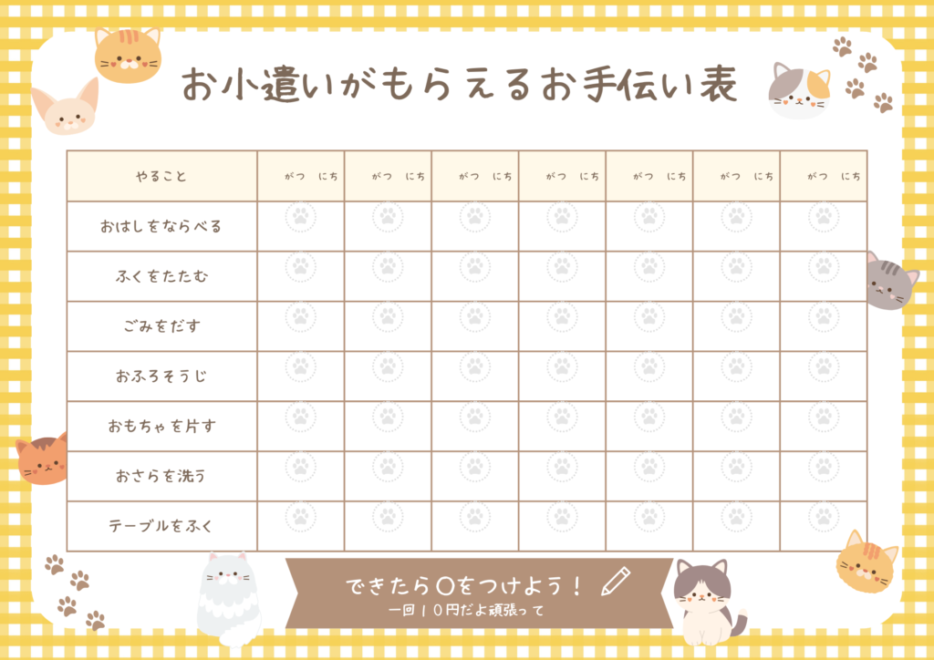 お小遣いがもらえるお手伝い表ダウンロード印刷可能